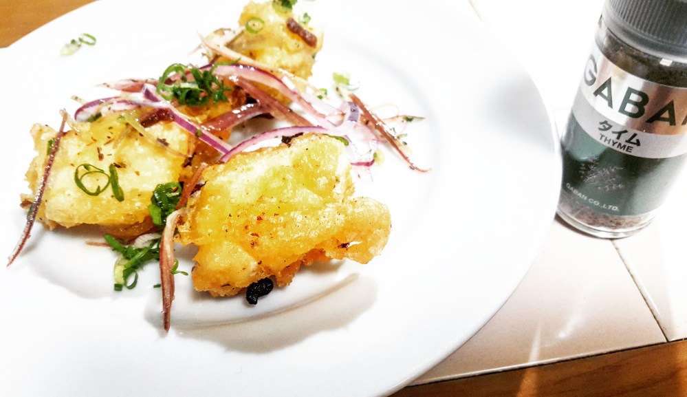 ■材料 豆腐……1丁 天ぷら粉……1カップ ビール……3/4カップ GABANタイム……小匙1 塩コショウ……ひとつまみ 【トッピング】 紫玉ねぎ……1/8個 みょうが……1個 酢……大匙1 オリーブオイル……大匙1 砂糖……小匙1 塩……ひとつまみ 青ネギ……1本
