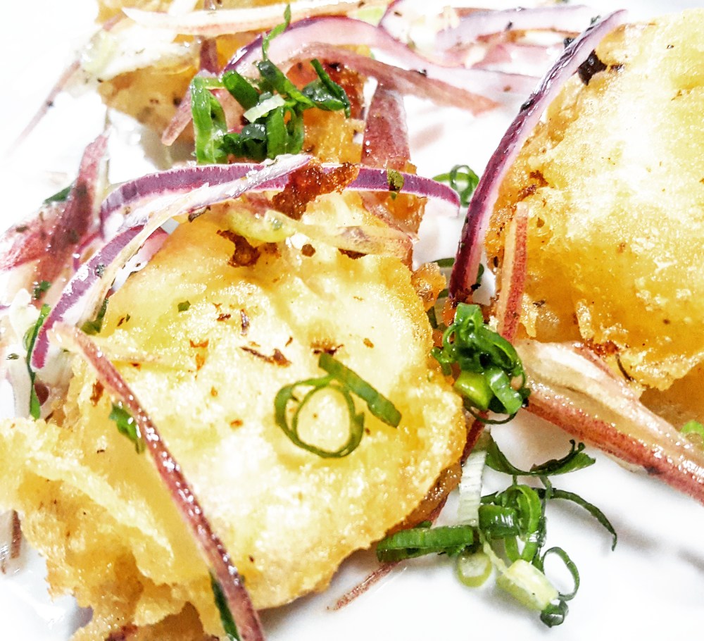5. スライスした紫玉ねぎとみょうがを酢、オリーブオイル、砂糖、塩でさっと和え、盛り付けた豆腐のフリットの上に飾ります。