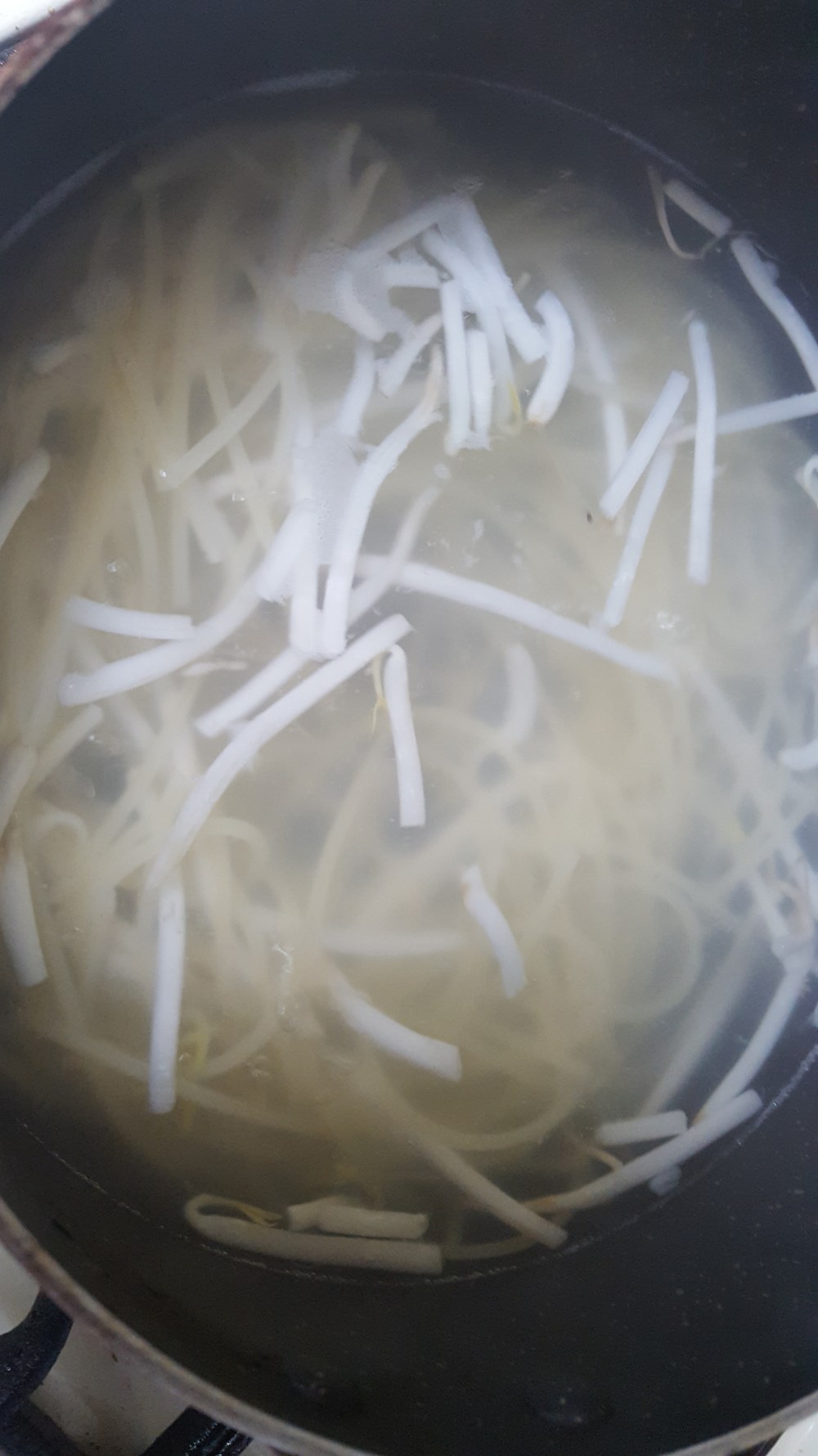 スライスした紫玉ねぎと、パスタ、モヤシを入れて全体を絡ませ、塩こしょうで味を調えます。