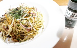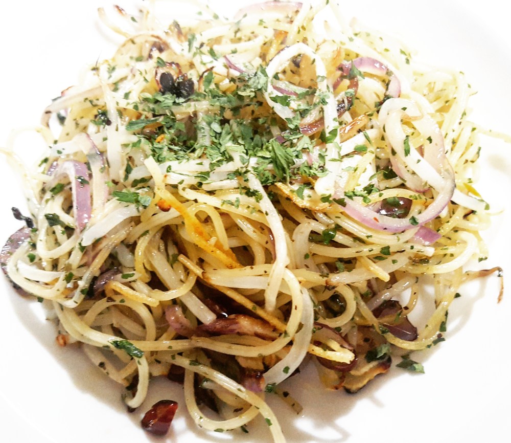 ■材料 スパゲティ……1人前 もやし……ひとつかみ にんにく……1片 鷹の爪……1本 紫玉ねぎ……1/4個 GABANイタリアンパセリ……大匙1 塩コショウ……ひとつまみ