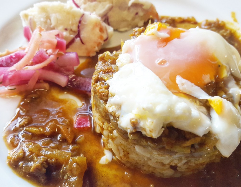 ■材料(1人前) ひき肉……大匙1杯程度 玉ねぎ……1/4個 にんにく……1片 しょうが……1片 カレー粉……大匙1 ケチャップ……大匙1 ウスターソース……小匙1 コンソメスープ……1カップ GABANカイエンペパー……小匙1/2~お好みの量 バター……1片 ごはん……お茶碗一杯程度(お好みで) 卵……1個