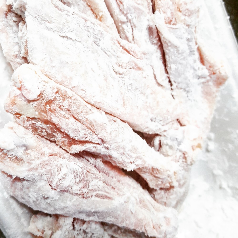 まずしっかりと片栗粉をまぶして、