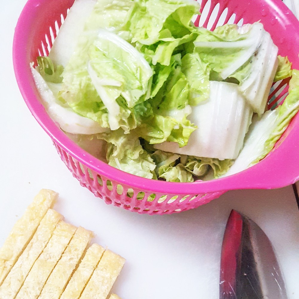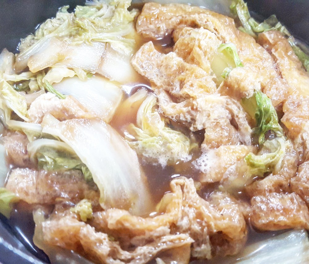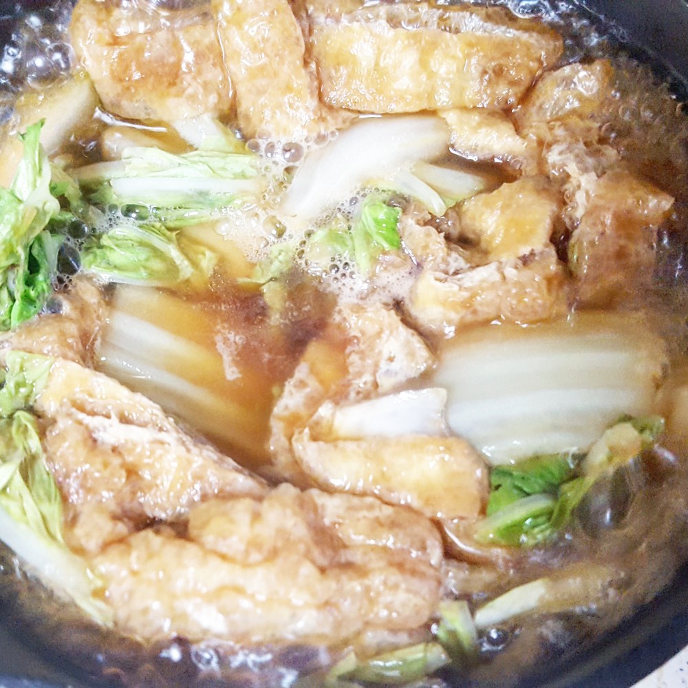 白菜をザクザク切って、細く切った油揚げを用意します。