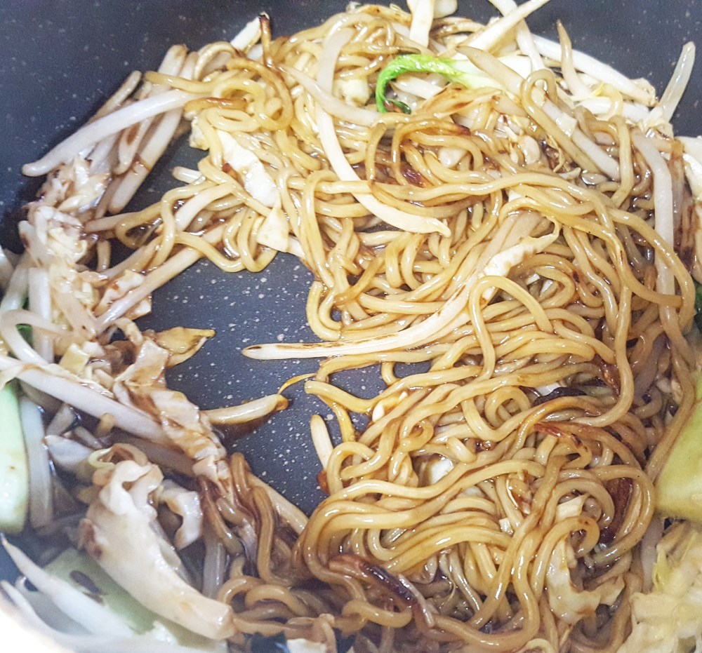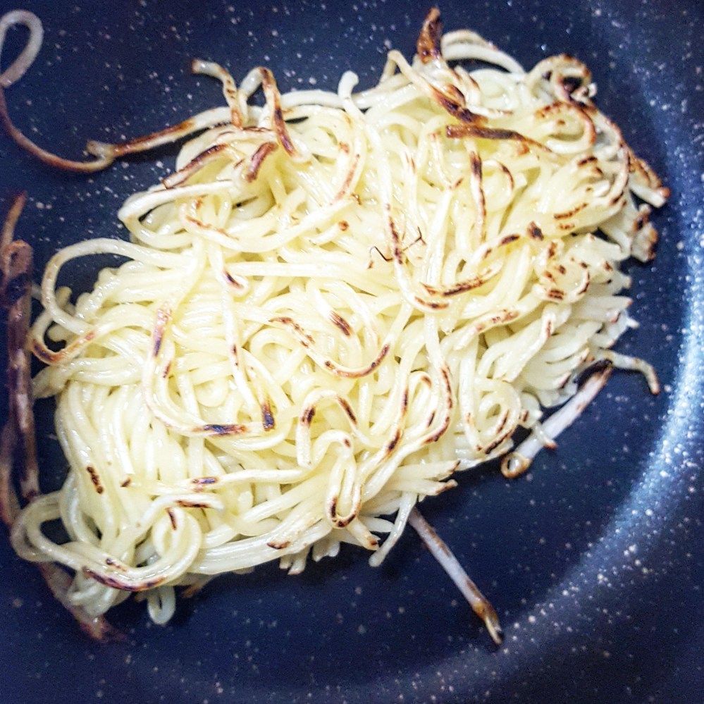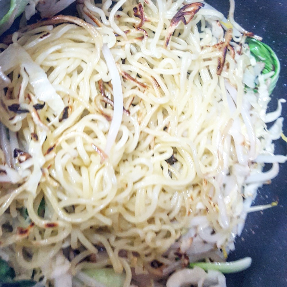 具になる野菜は別に炒めておいて、麺だけを塊のまま崩さずに。
