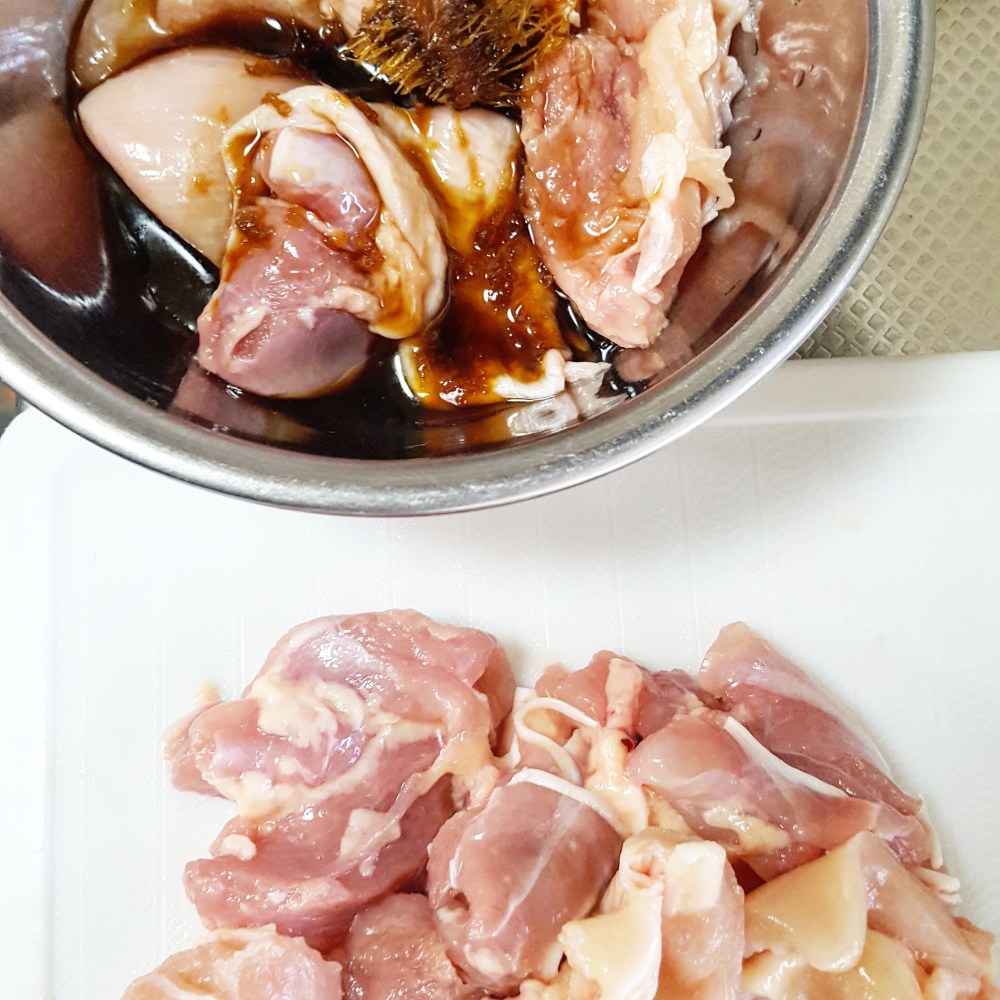 おろしたにんくにとしょうが、醤油、みりん、砂糖に酒を足したタレに漬けて冷蔵庫で20~30分。