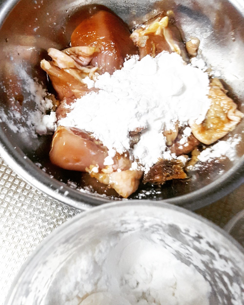 漬け込んだら、カリカリ食感の秘訣、片栗粉を。