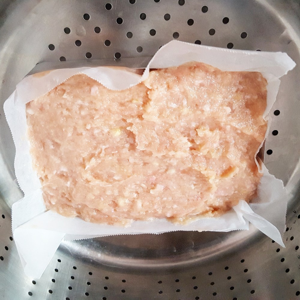 松風焼きは、鶏の挽き肉を甘めに味つけて蒸して仕上げます。