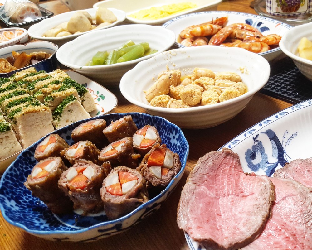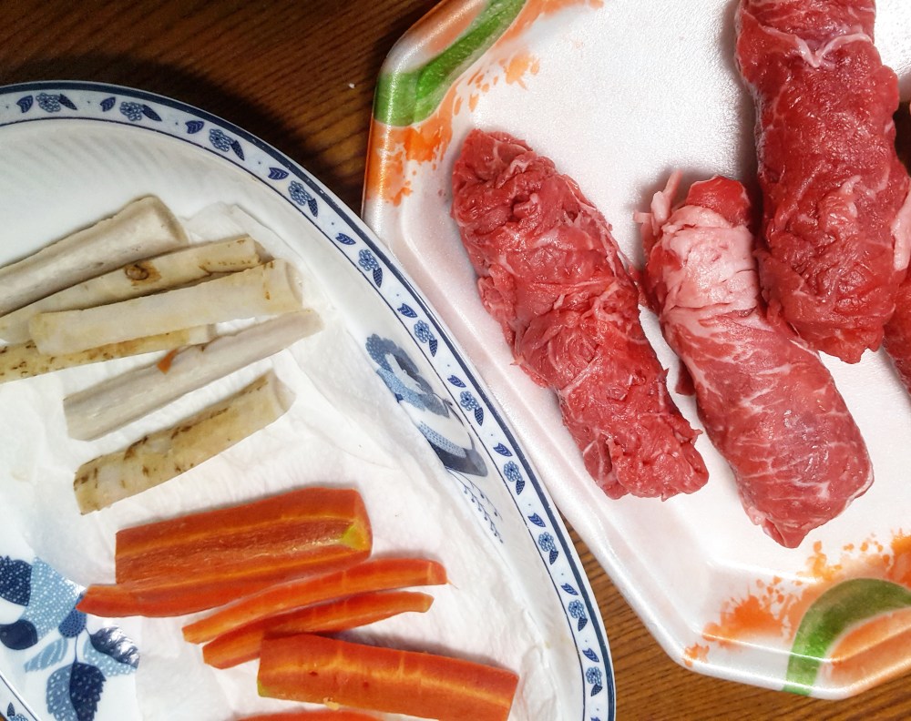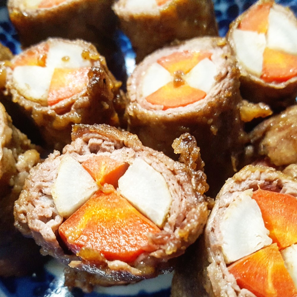 八幡巻は牛肉でゴボウとニンジンを巻いて、甘辛い照り焼きに。