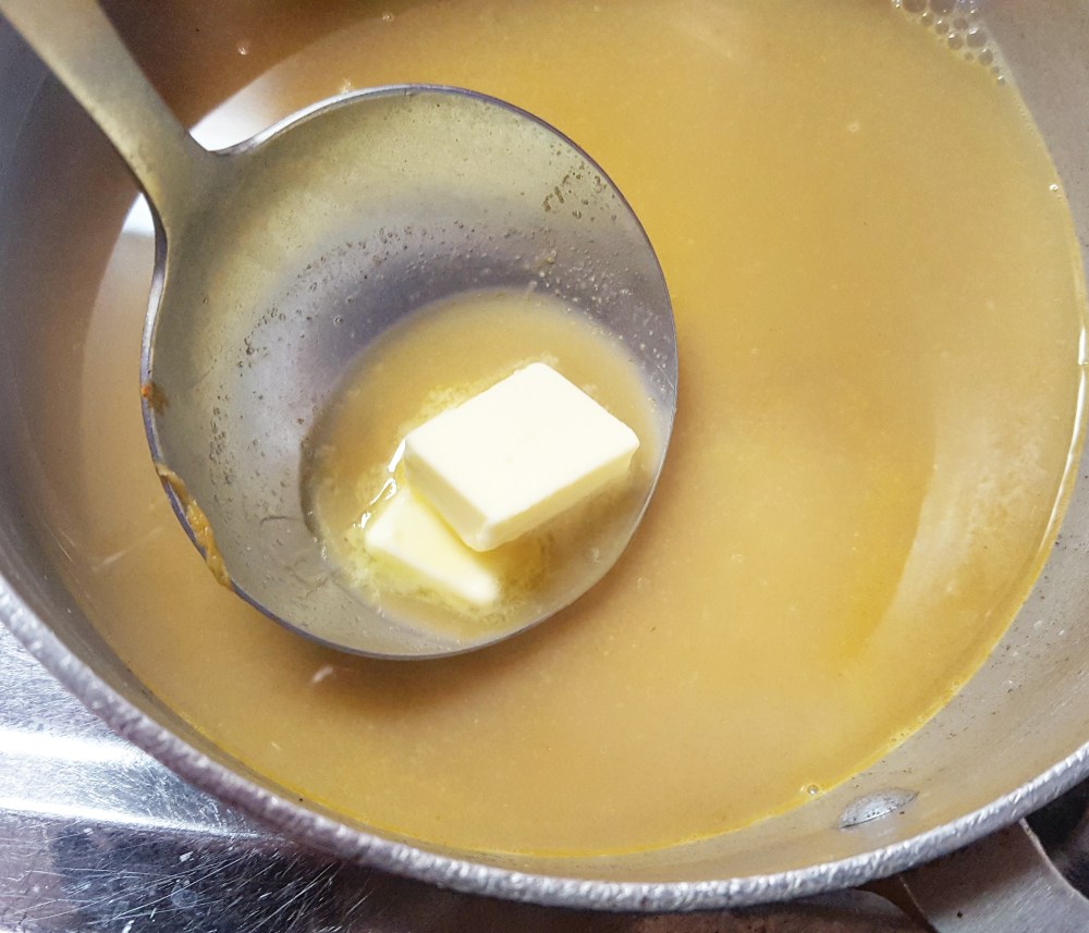 煮詰めたら、塩コショウで味を調えて、バターを溶かします。