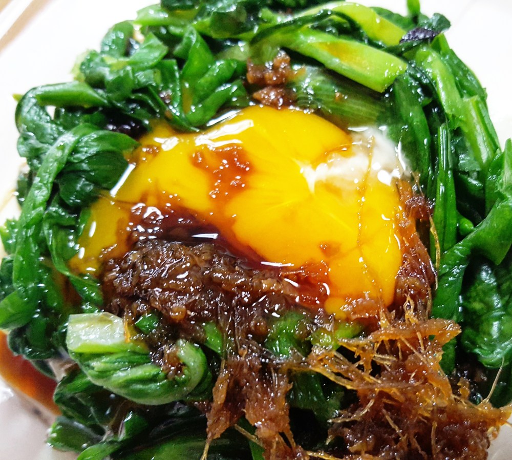 ゆでたニラにそのタレをかけて、卵黄を載せれば出来上がりです。