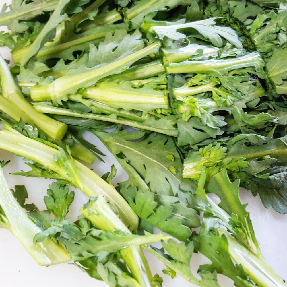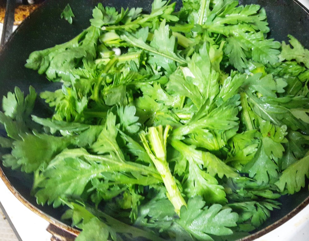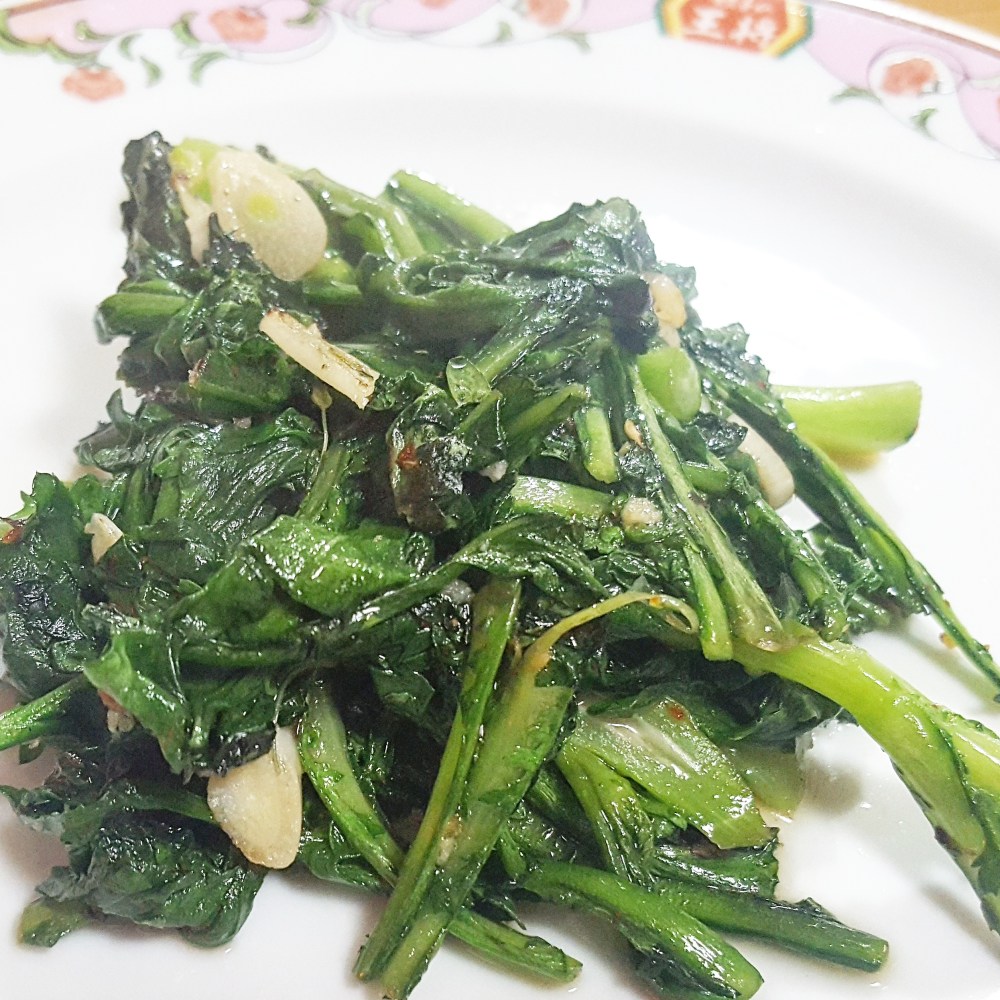 スライスしたニンニクをゴマ油でいためて、香りが出てきたら、一口サイズに切った春菊を入れてさっと炒めます。