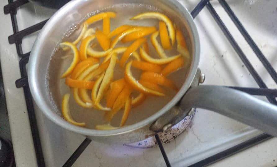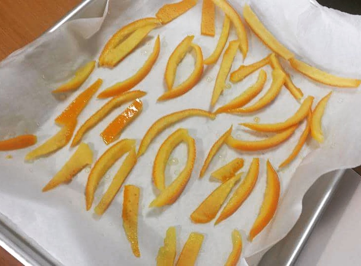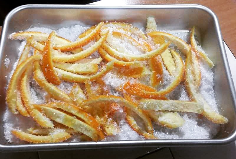 オレンジの皮は白いわたを綺麗にとって、砂糖で漬けます。