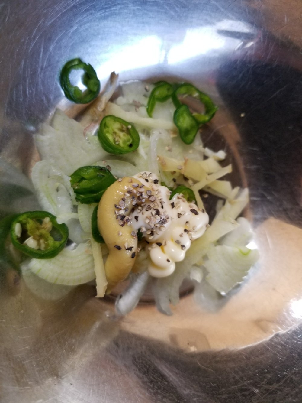 玉ねぎのスライスと生姜の千切り、ししとうの半量を、からし、マヨネーズ、こしょうであえます。