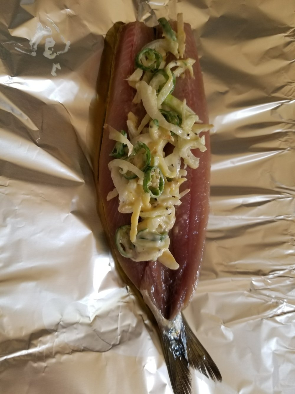 ししとう、しょうが、玉ねぎと香りの強い野菜にからしマヨネーズをあわせて、控えめの塩分がわりのアクセントを。