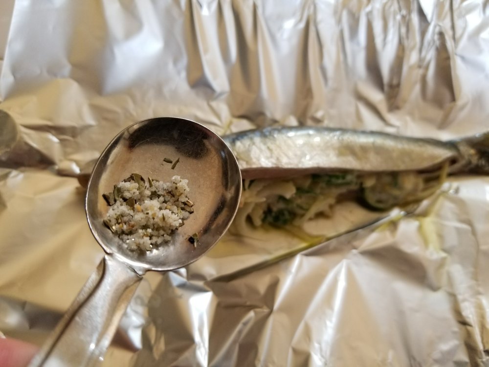 いわしの身を閉じるようにして、皮に香りソルトイタリアンハーブミックスをふります。