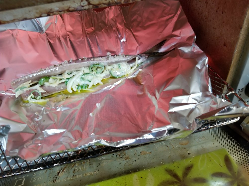 オリーブオイルを塗ったアルミホイルにのせて、オーブントースターで五、六分、いわしに火が通るまで焼きます。