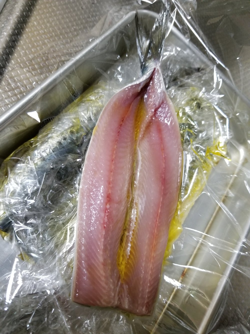 開いたいわしをオリーブオイルを塗ったラップにのせて、両面にオイルをまぶし、ぴっちりと包んで、冷蔵庫で15分マリネします。