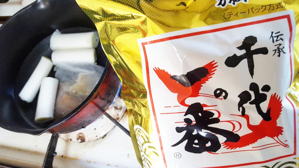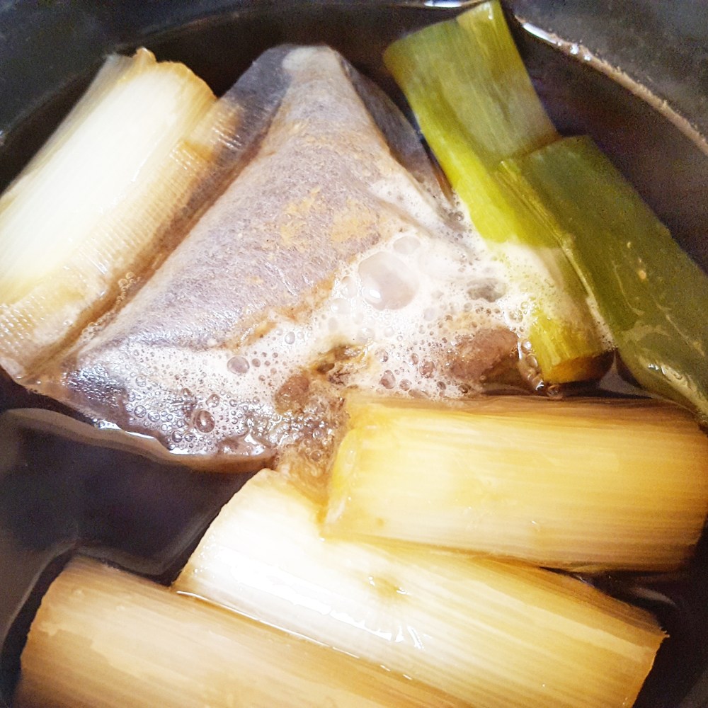ねぎを適当な長さに切って、和風だしでやわらかくなるまで煮込みます。