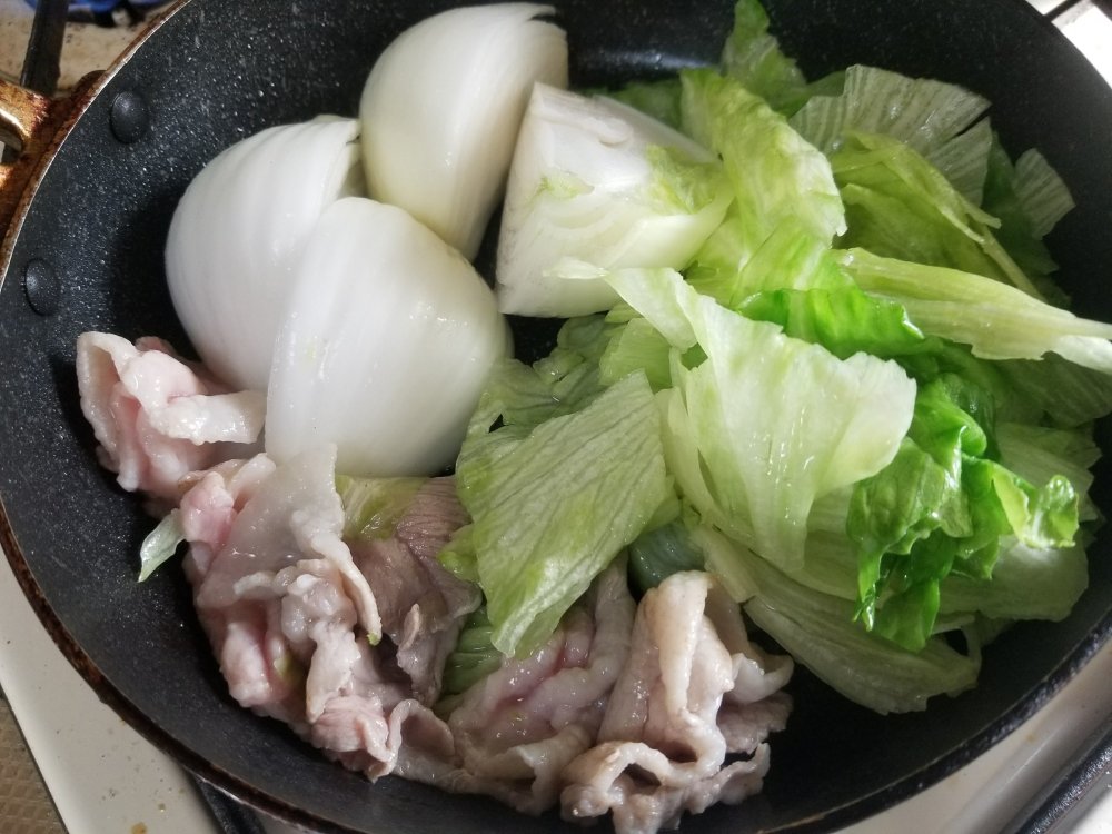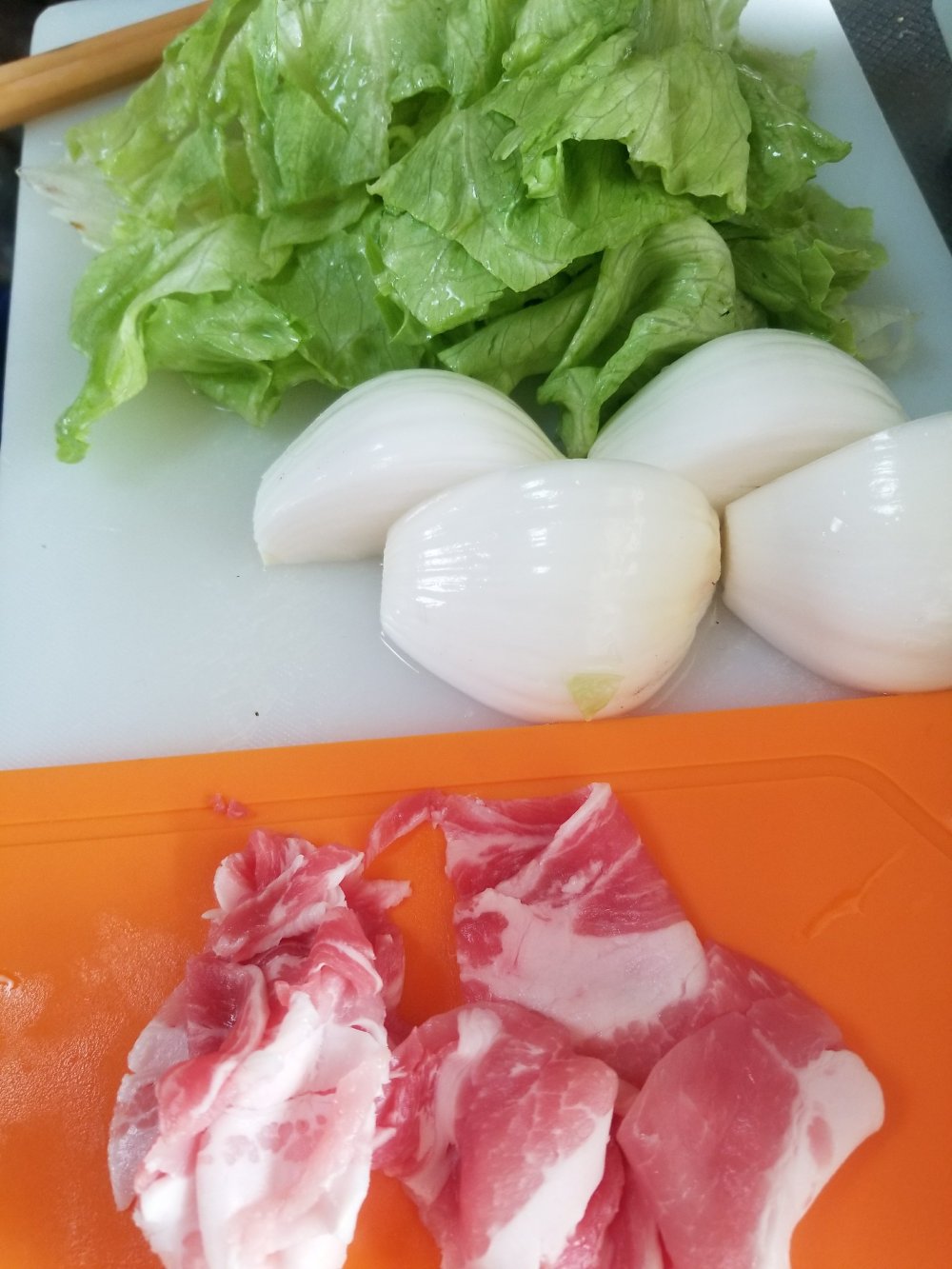 レタスをざくざくと切り、新玉ねぎは1/4にカット、豚バラは食べやすく一口大にします。