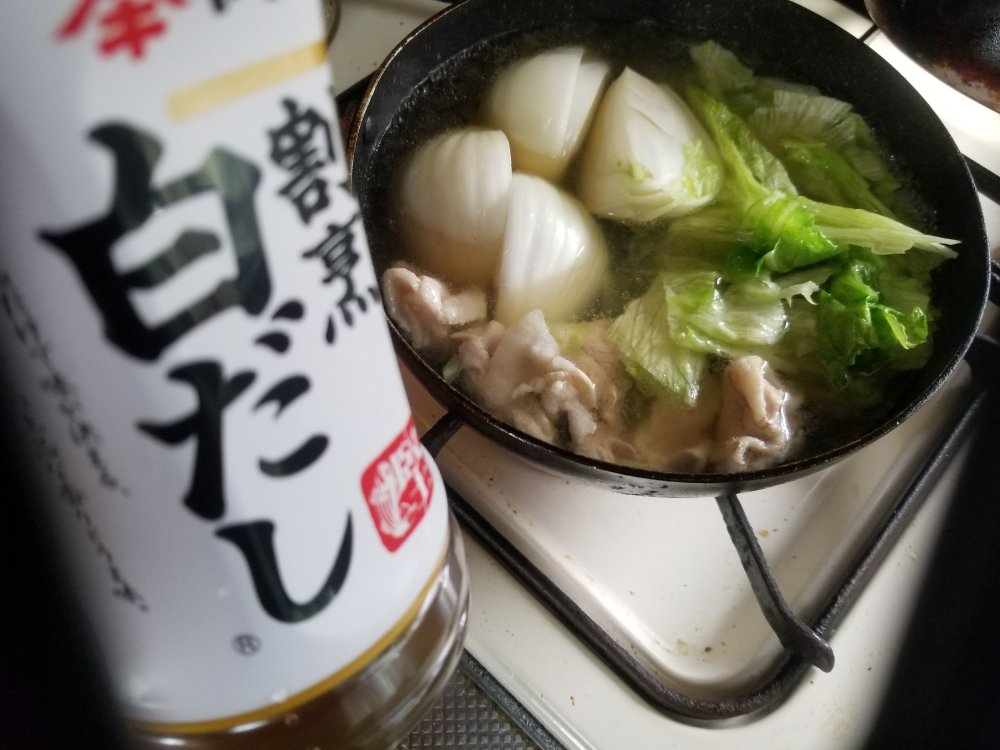 「ヤマキ割烹白だし」と水を入れて煮ます。