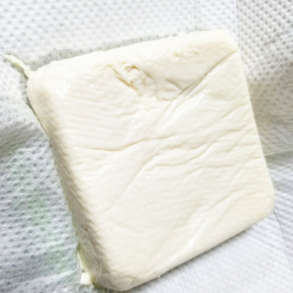 まず、とうふをキッチンペーパーに包んで冷蔵庫で一晩置きます。