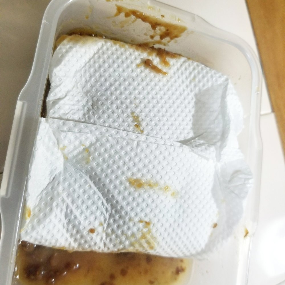 余ったキッチンペーパーで豆腐を完全に包み、蓋をして冷蔵庫に二時間ほど置きます。