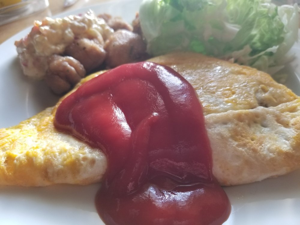 オムライスの黄色と赤のコントラスト。