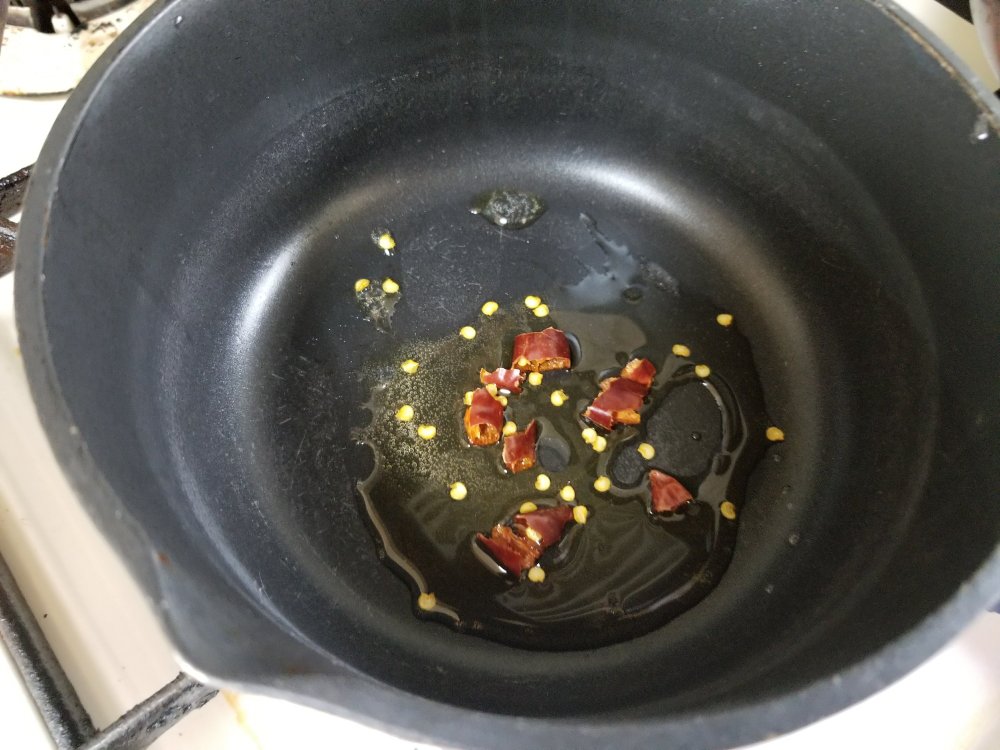 小口切りにした鷹の爪を胡麻油でいため、香りを出します。