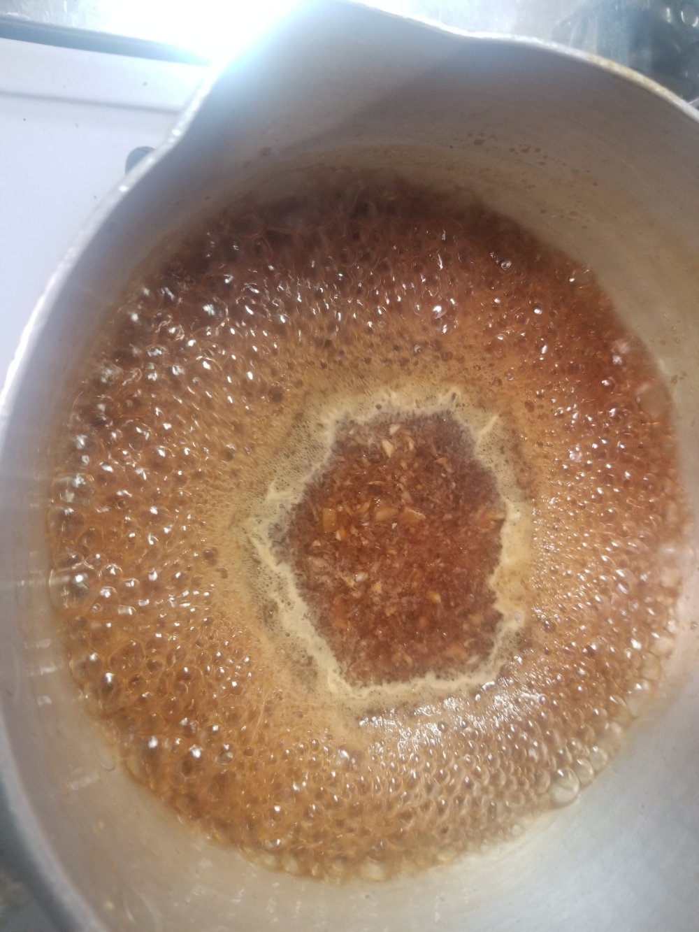 おろししょうがとおろしにんにくを醤油、みりん、砂糖と一緒に火にかけます。