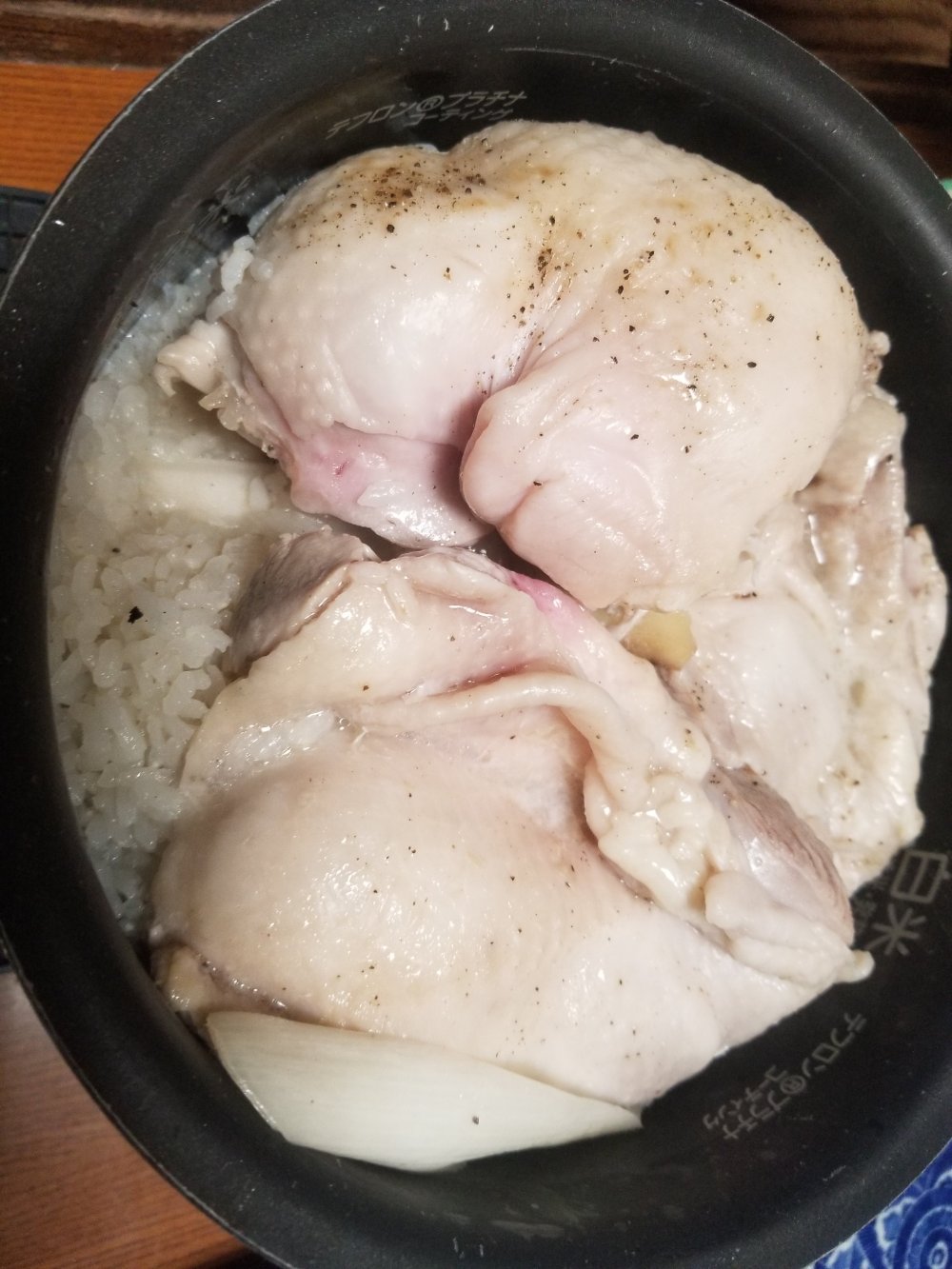 お米が透き通ってきたら、鶏もも肉、ねぎ、しょうがと一緒に炊飯器へ入れてスイッチオン。