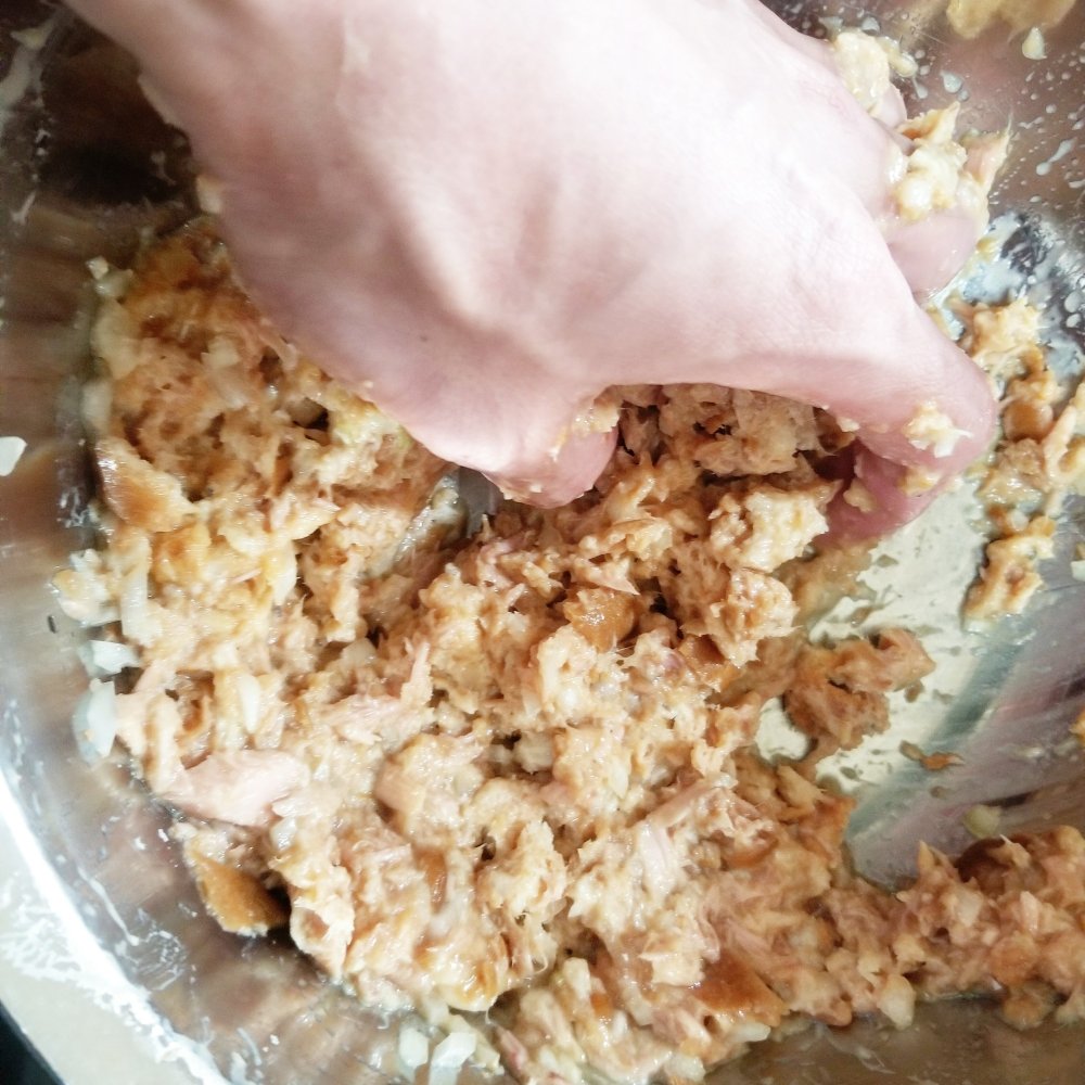 たまご、玉ねぎ、ふやかしたパンの耳(またはパン粉)とあわせ、ケチャップやマヨネーズで調味しながら、