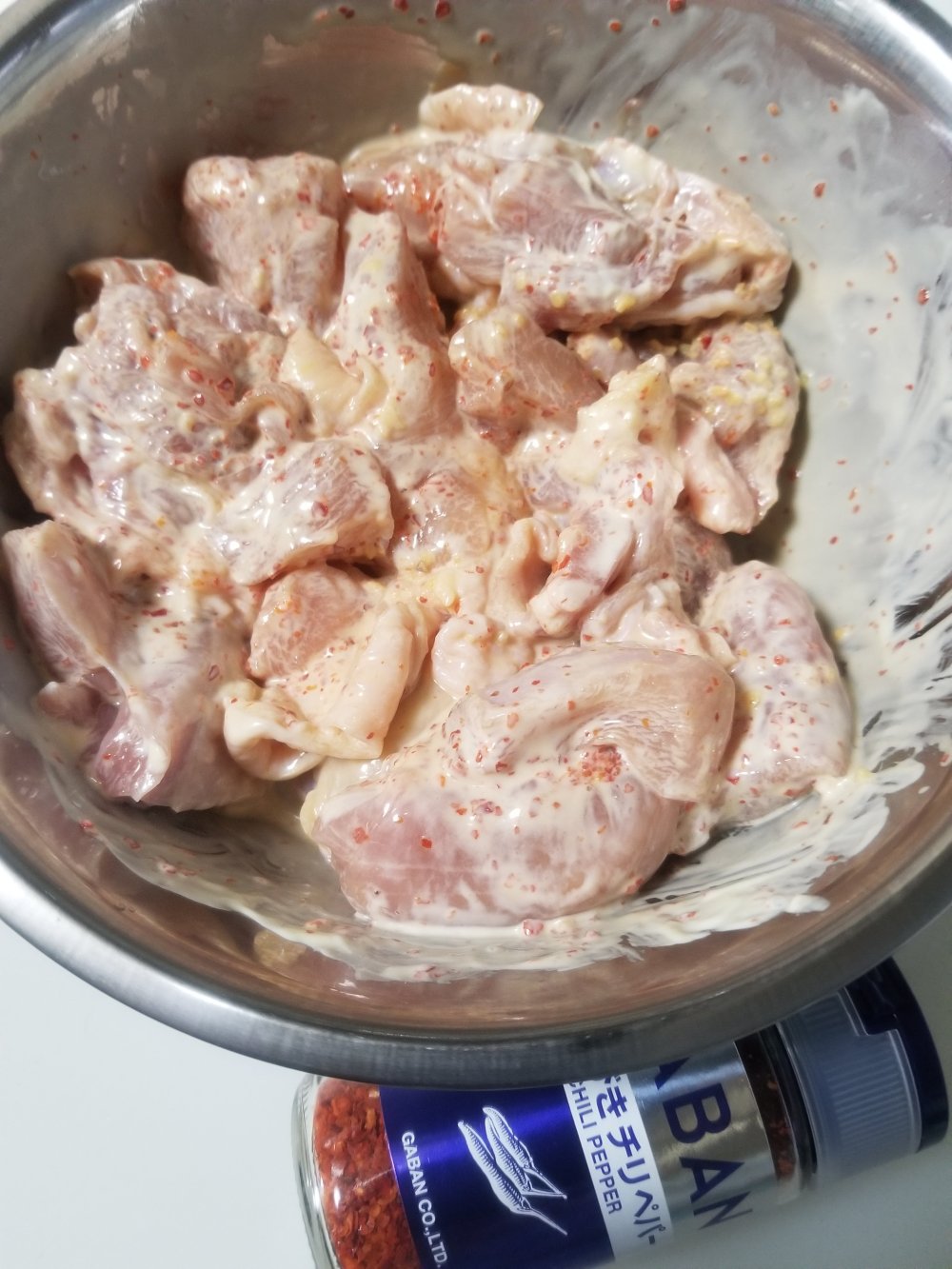一口大に切った鶏もも肉をボウルに入れ、マヨネーズ、白ワイン、醤油、おろしにんにくにGABANあらびきチリペパーを入れてよく混ぜながらもみこみます。