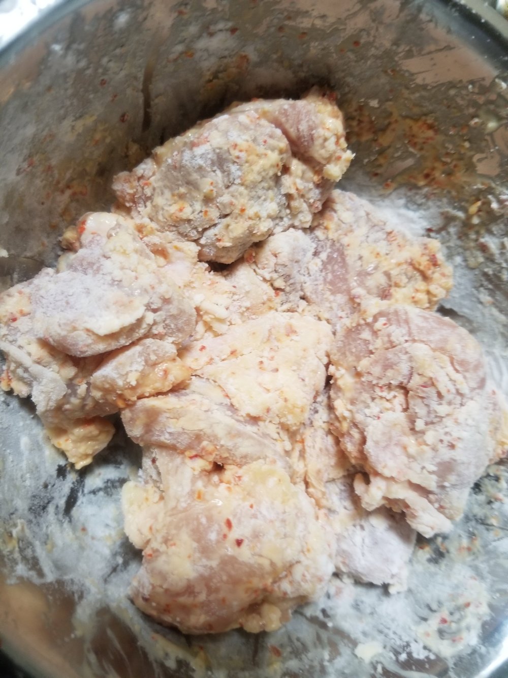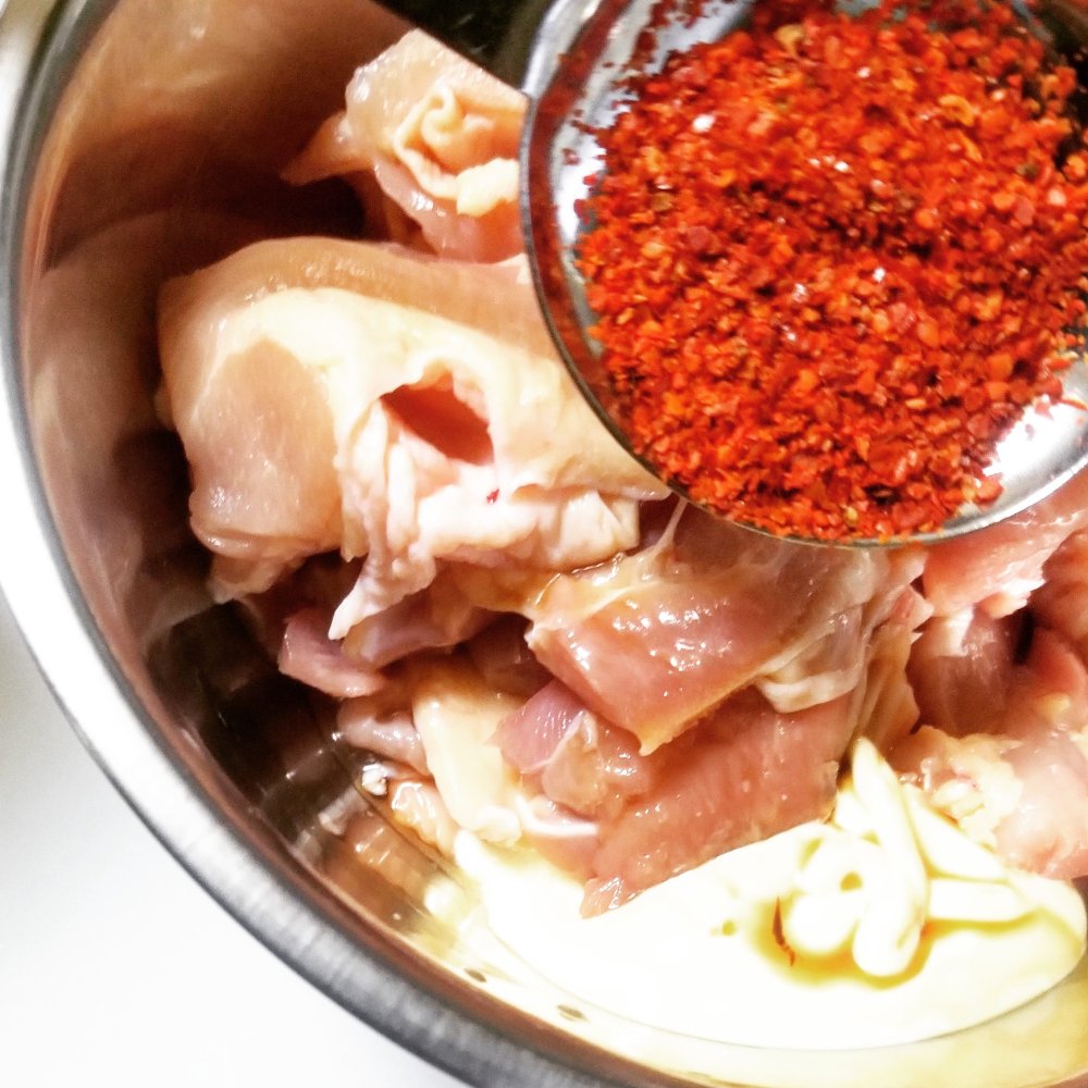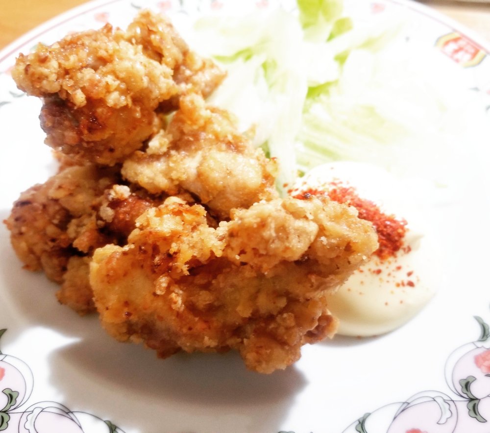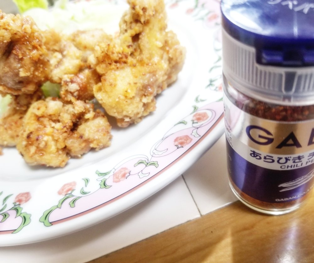 ■材料(2人分) ・鶏もも肉……1枚 【下味】 ・GABANあらびきチリペパー……大匙1 ・マヨネーズ……大匙1 ・白ワイン……大匙1 ・醤油……小匙1 ・おろしにんにく……小匙1 【衣】 ・片栗粉……大匙5~6程度
