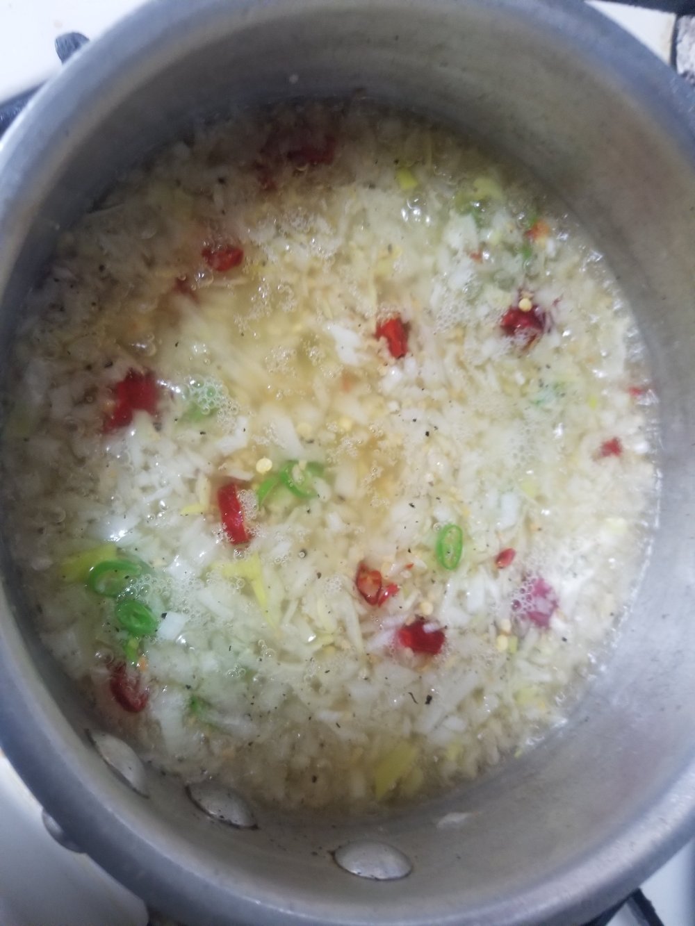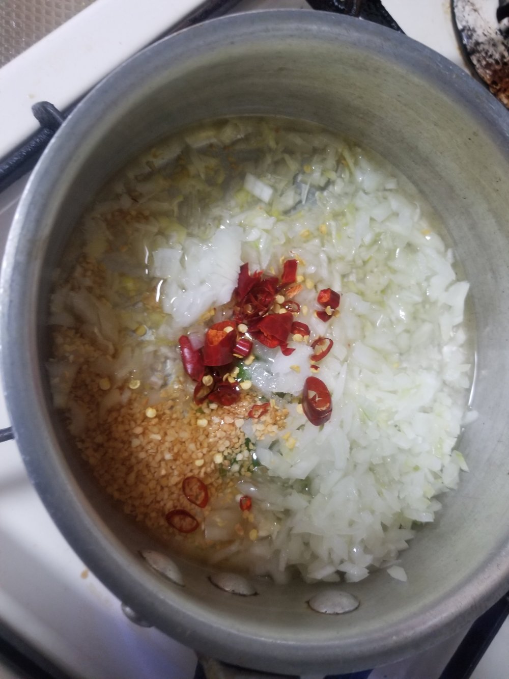 ソースはみじん切りにしたねぎ、玉ねぎ、小口切りの鷹の爪、GABANあらびきガーリックをごま油、サラダ油とともに火にかけます。