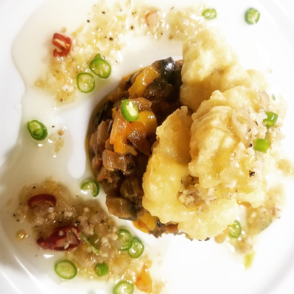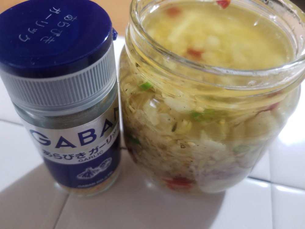 ■材料(二人前) ・鱧(骨切りしたもの)……1尾分 ・塩コショウ……ひとつまみ ・てんぷら粉……1カップ ・水……3/4カップ ★ソースの材料 ・GABANあらびきガーリック……小匙1 ・ねぎ……1/4本 ・玉ねぎ……1/4個 ・鷹の爪……2本 ・ごま油……大匙1 ・サラダ油……大匙3~4程度 ・塩……小匙1 ★トッピング ・青唐辛子……2本