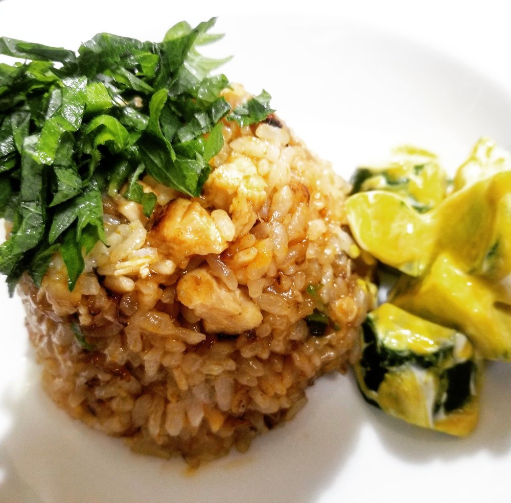 ■材 料 (1人分) 鶏ささみ……1本 にんにく……1片 玉ねぎ……1/4個 えのき……1/2束 ご飯……お茶碗1杯分 ウスターソース……小匙1 レッドカレーペースト……大匙2 大葉……5枚 【付け合わせ】 きゅうり……1/2本 マヨネーズ……大匙1 フレンチマスタード……小匙1 こしょう……ひとつまみ