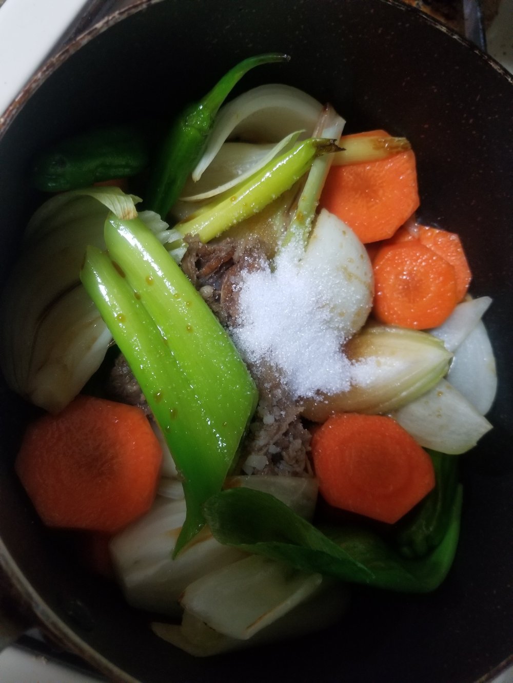 みじん切りにしたしょうがを炒め、香りが出てきたら肉と食べやすいサイズに切った玉ねぎ、にんじん、ねぎと丸のままのにんにくを加えます。