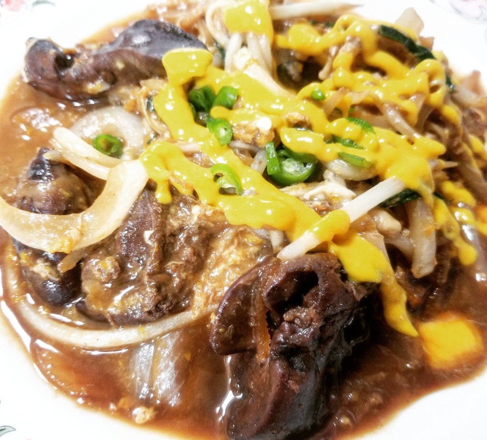 もやし、ニラ、玉ねぎを炒めて全体に油がなじんだら、レバーとその煮汁を入れて全体を手早く絡めたら出来上がり。