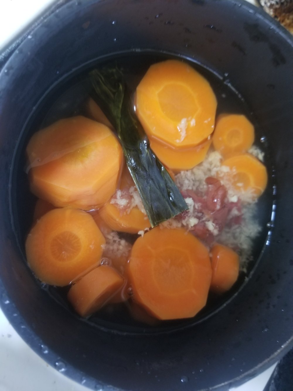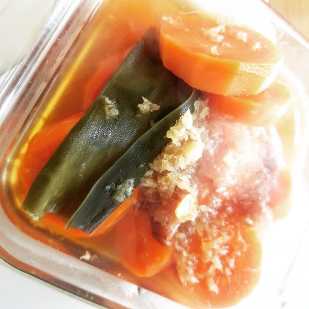 レンジしたにんじん、水、2の合わせ調味料を昆布と一緒に火にかけ、にんじんにすっと串が通るようになったら塩を入れて火を止めます。
