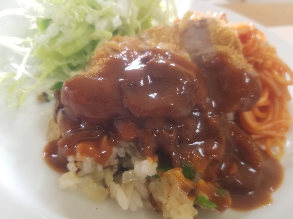キャベツと一緒にピラフとナポリタンを盛りつけて、その上にカツ+デミグラスソース。