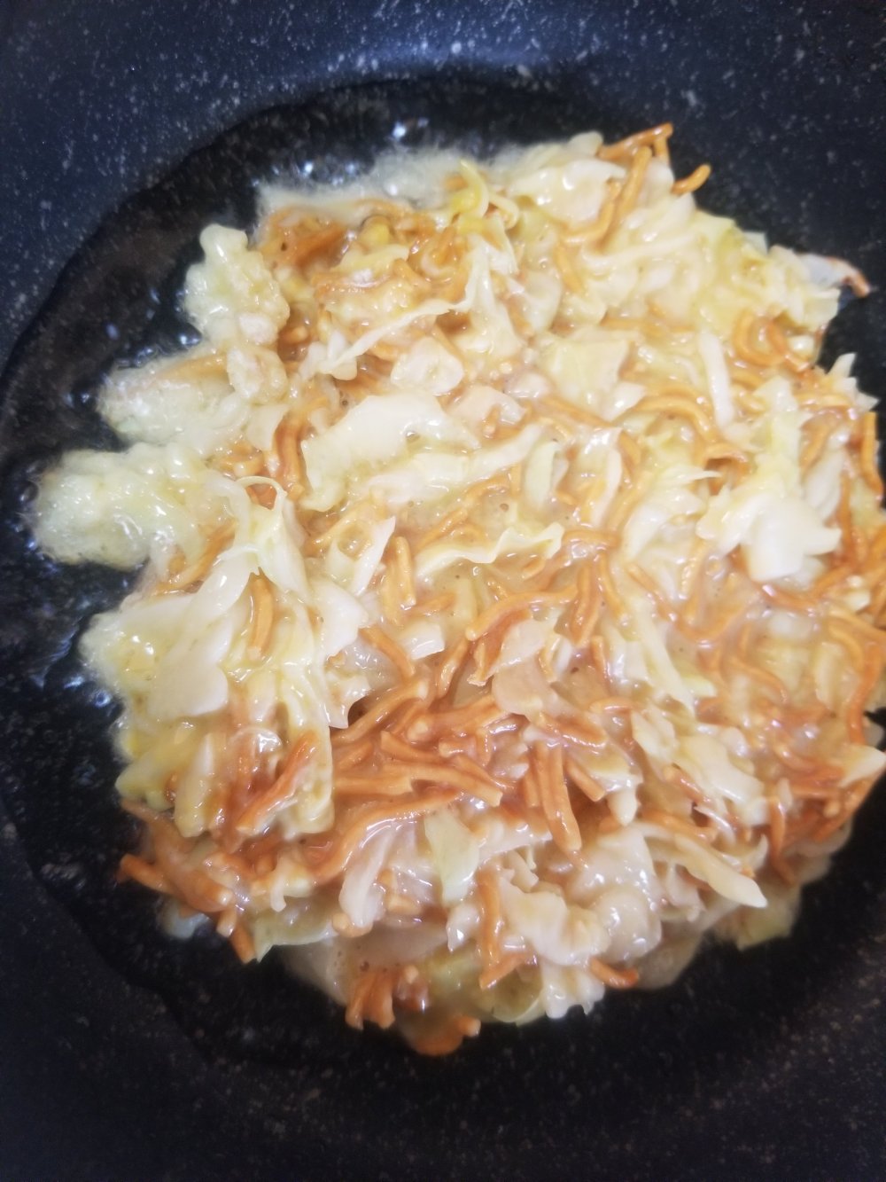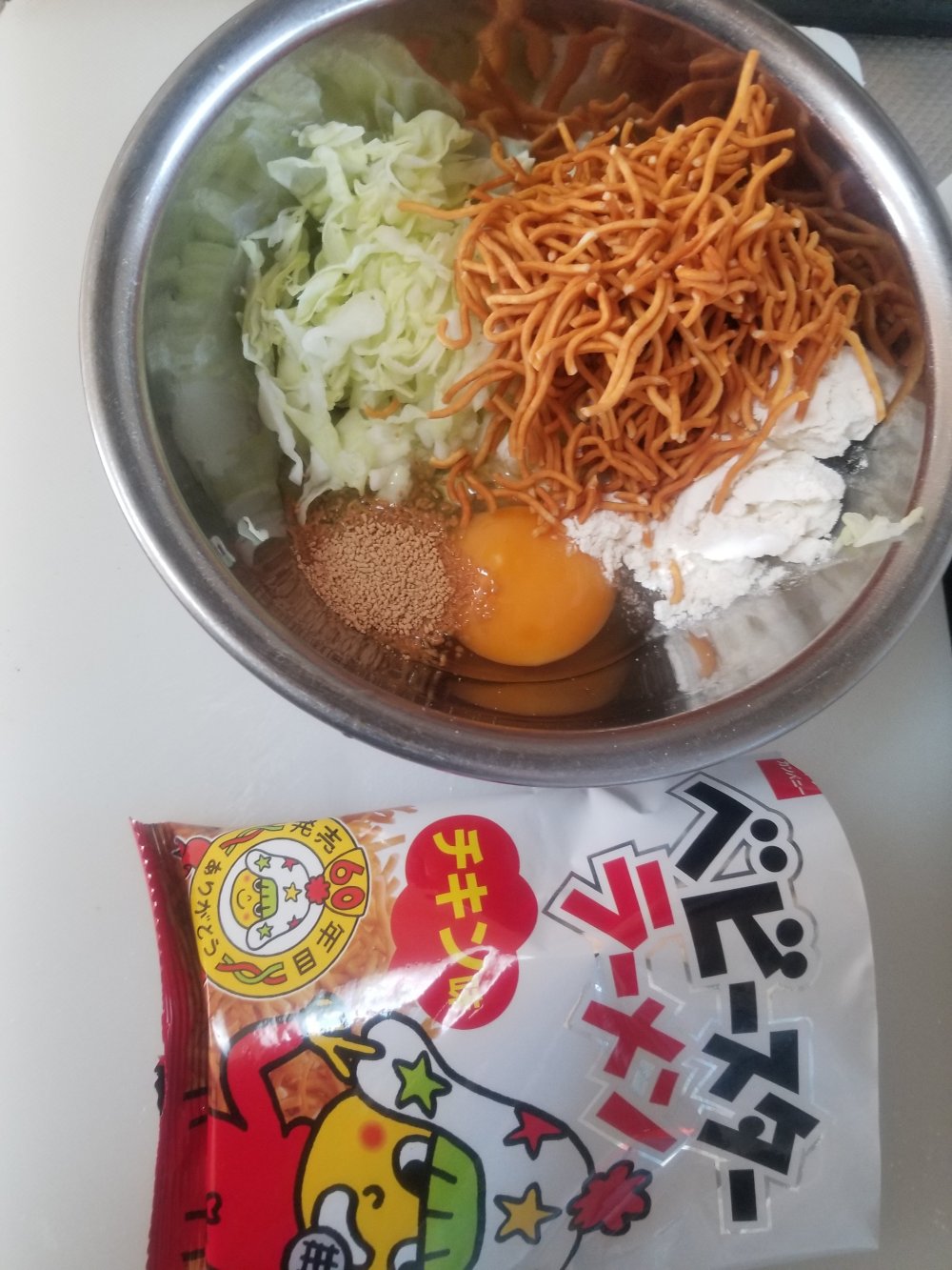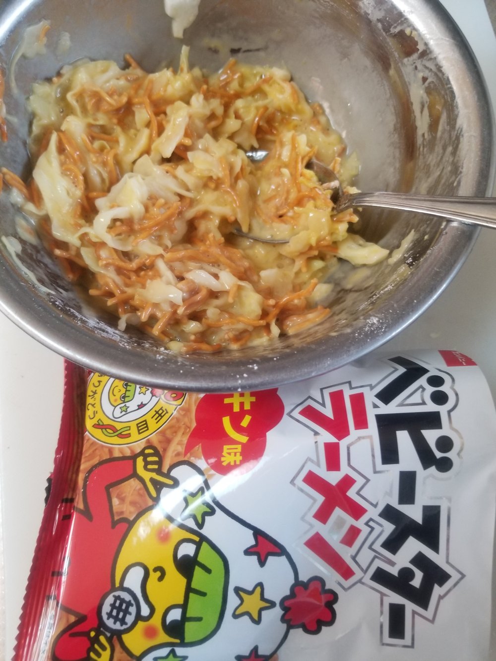 ■材料(1人前) ・ベビースターラーメン……1袋 ・キャベツ……1枚 ・小麦粉★……大匙2 ・卵★……1個 ・粉末和風だし★……小匙1 ・水★……大匙1 ・お好み焼きソース……大匙2程度 ・マヨネーズ……大匙1程度 ・万能ねぎ……1本
