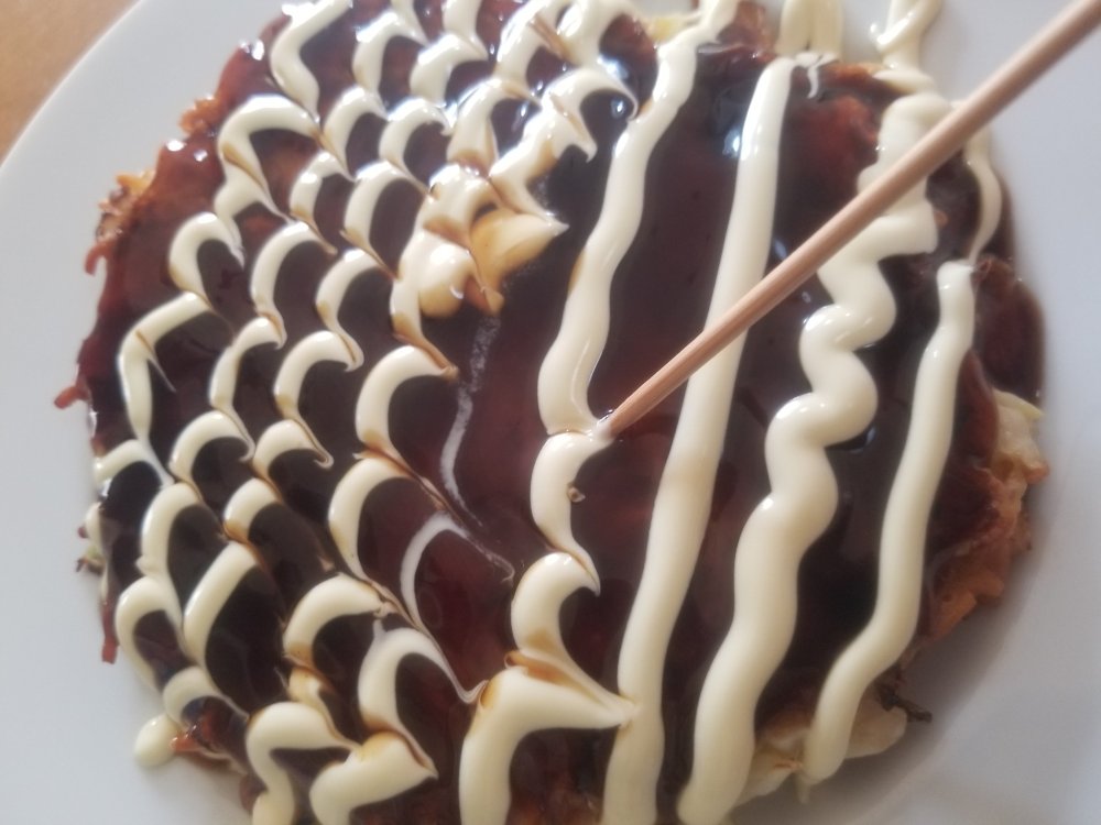 お好み焼きソースをまんべんなく塗った上に、マヨネーズを等間隔に線を引くように塗り、