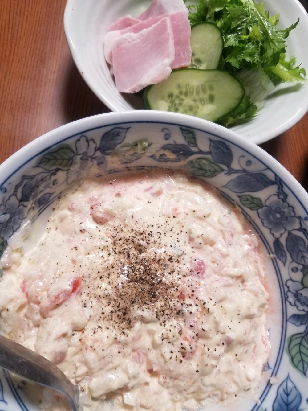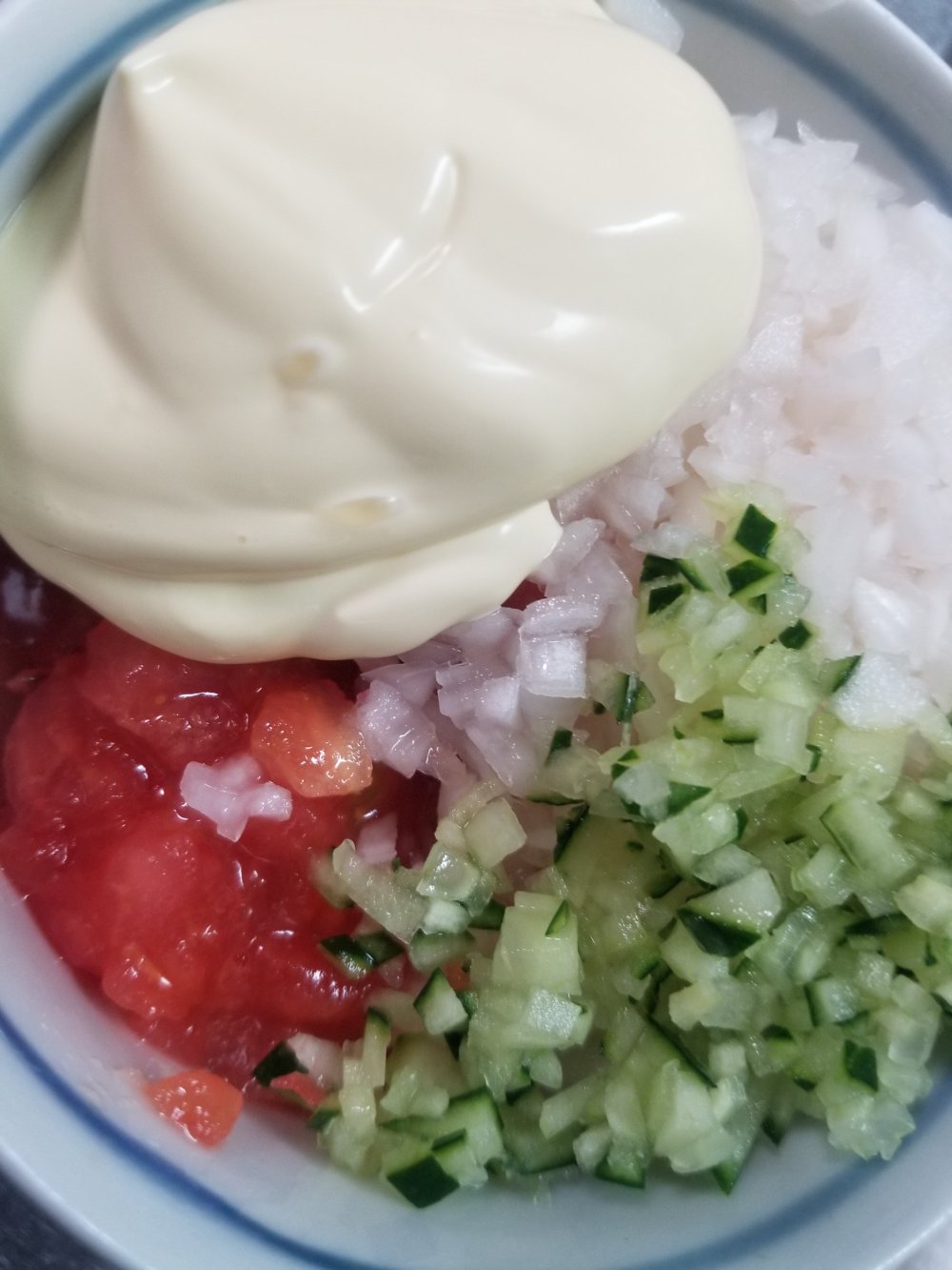 みじん切りにした玉ねぎ、きゅうりと一緒にざく切りのトマトをマヨネーズで和えて、塩コショウで味を調えます。
