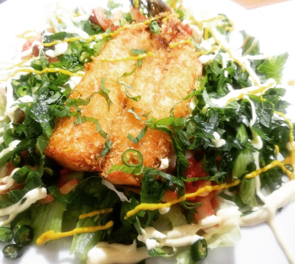 その上にかりっと揚がったフライを載せて、小口切りにした万能ねぎと青唐辛子、千切りの大葉を散らします。