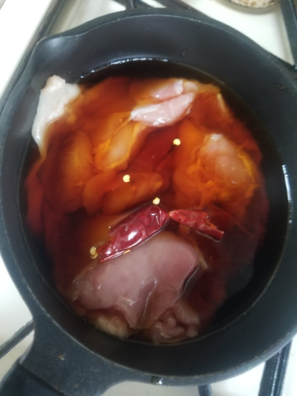 鶏肉はポン酢と砂糖、みりんに鷹の爪を入れて煮ました。