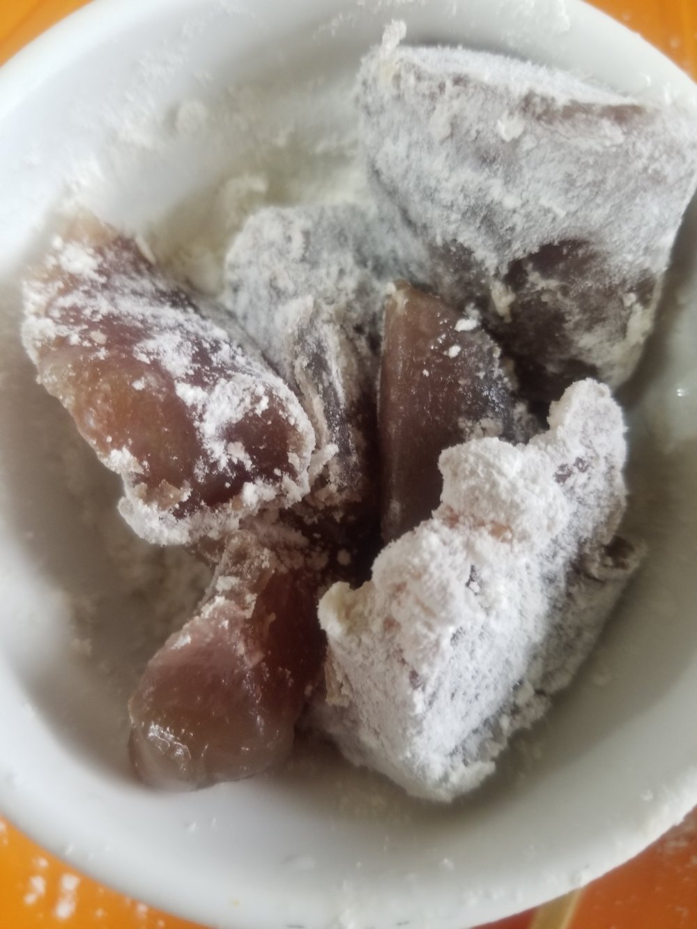 かつおの柵を一口大に切り分け、塩コショウして小麦粉をまぶします。