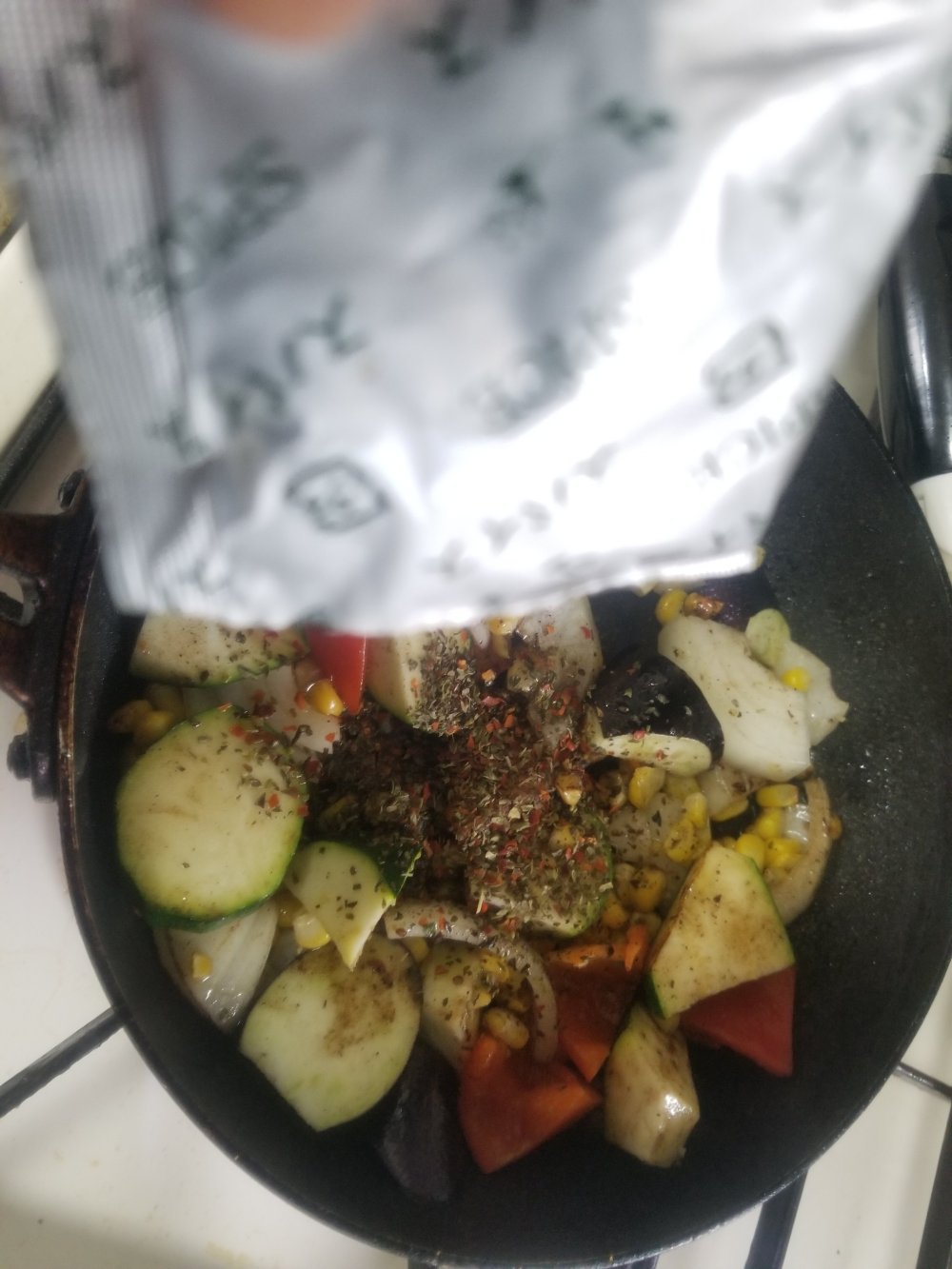 フライパンにかつおを戻して野菜と合わせ、にんべん「だしとスパイスの魔法」シリーズ《イタリアンソテー》のスパイスを投入。