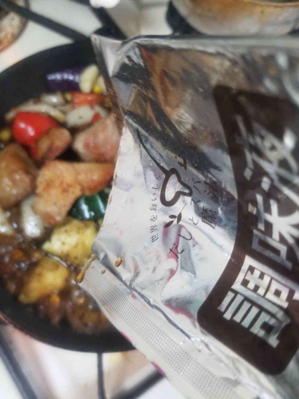 全体に絡めたら、にんべん「だしとスパイスの魔法」シリーズ《イタリアンソテー》の調味液を入れます。