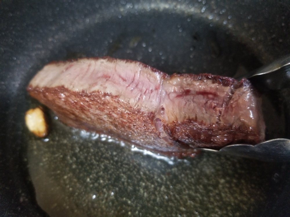 両面が焼けたら、トングでお肉を立てて、側面もしっかりと焼いていきます。