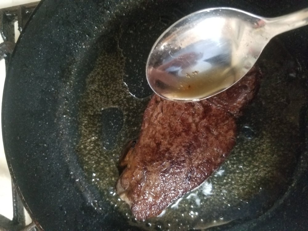 焼いている途中、スプーンですくって油をかけながら、